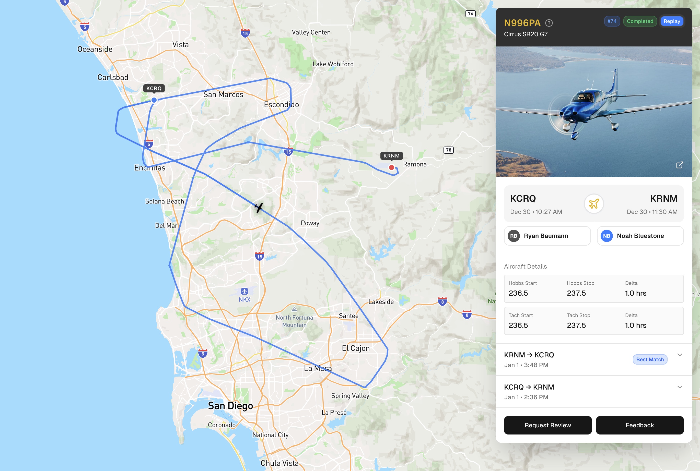 View comprehensive flight logs with automatically routed ADSB data in your Sky Schedule map. Request Google reviews from completed flights and see real-time maintenance updates, all in one platform.