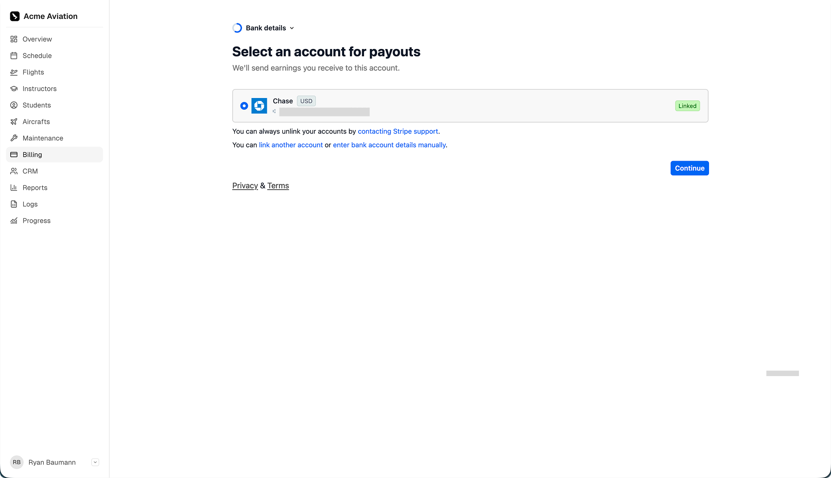 We've partnered with Stripe - the gold standard in payment processing - to bring flight schools a seamless, professional billing experience built specifically for how you operate. From invoicing students to managing instructor payments, everything lives in one place.