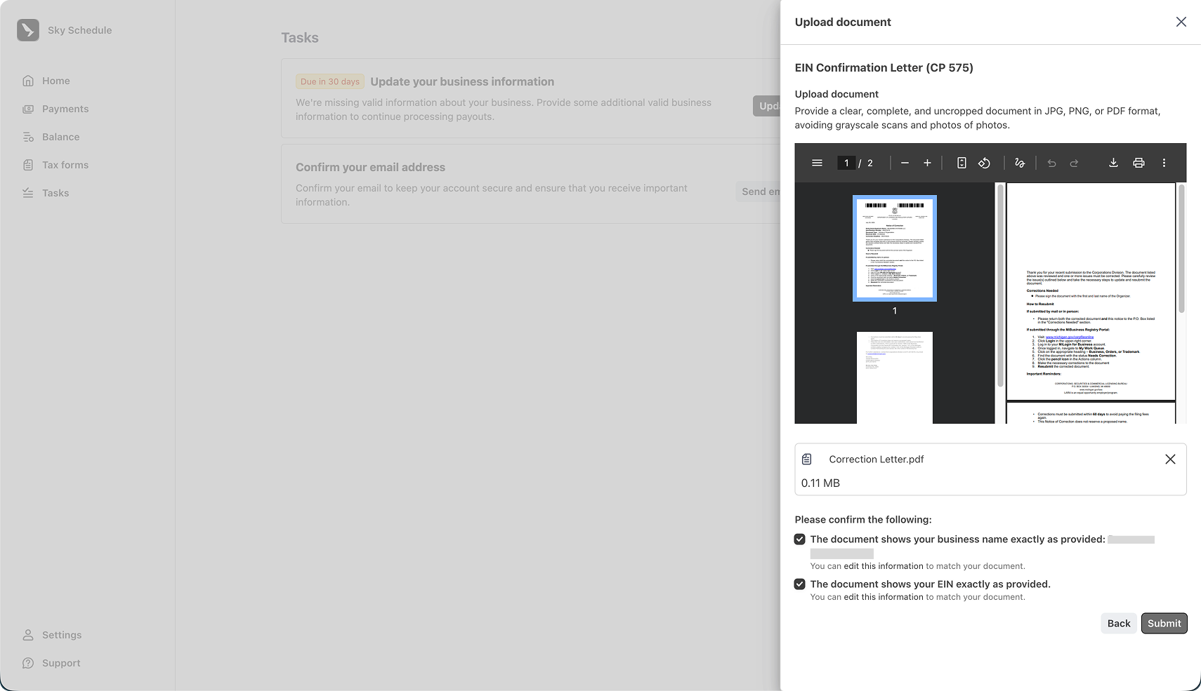 - Action Required - something needs your attention (for example, a missing EIN confirmation or other business detail)